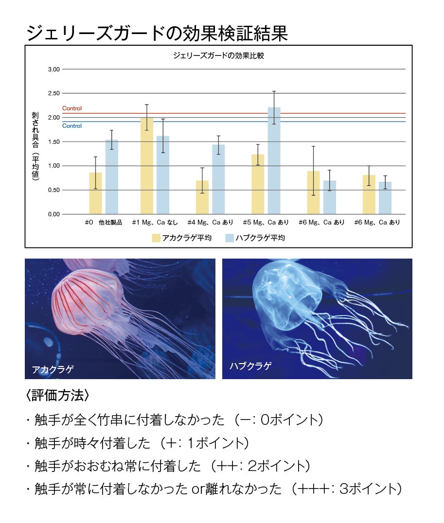 マグネシウムイオンとカルシウムイオンを独自の比率で配合し、クラゲの毒針「刺胞」の発射を抑える処方を実現。愛媛県立長浜高校・水族館部「チームニモ」が解明した“共生の仕組み”を応用し、実験結果をもとに商品化されました。