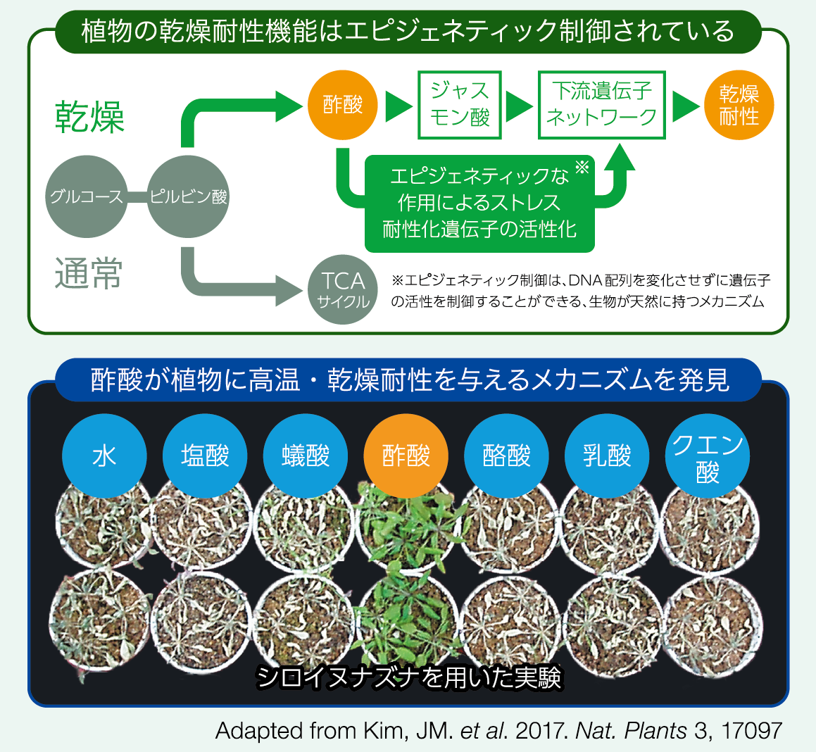 図1: 植物の乾燥耐性機能と酢酸に関するメカニズム