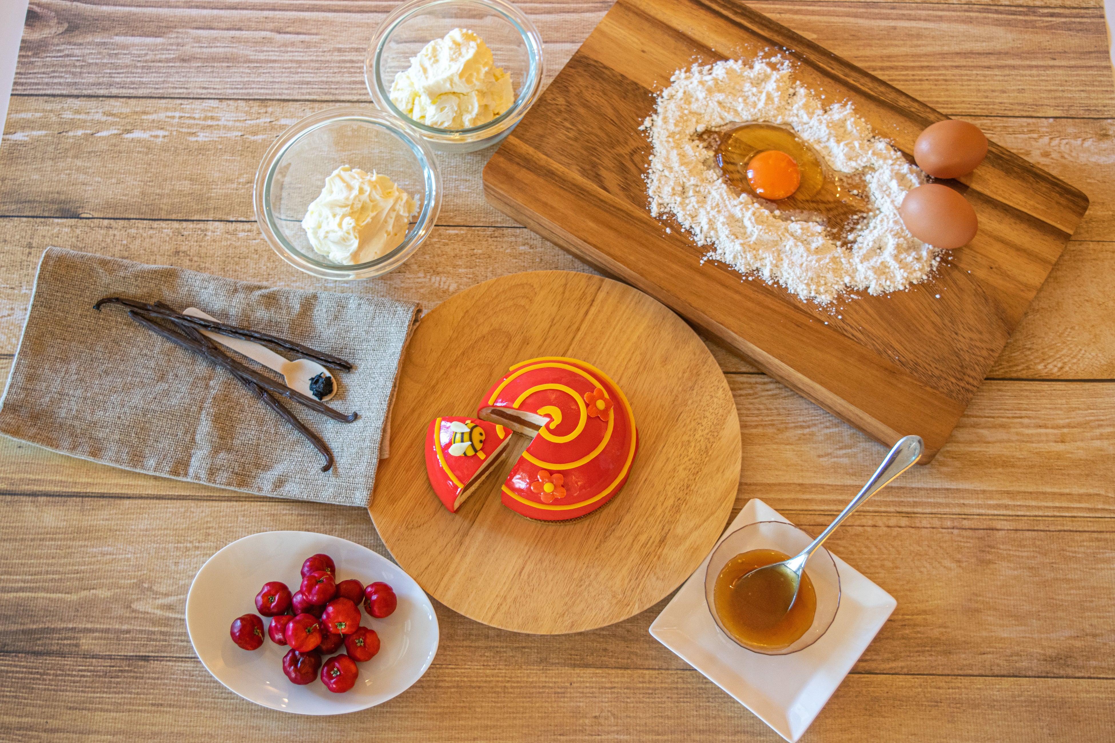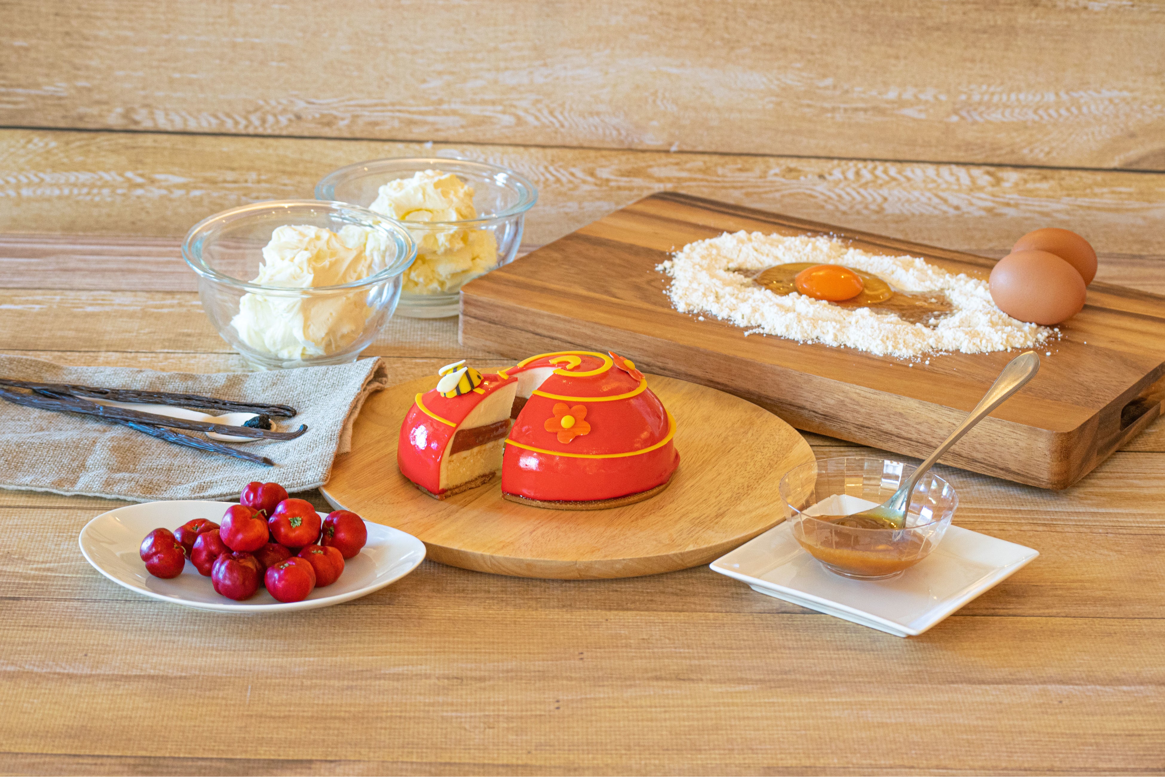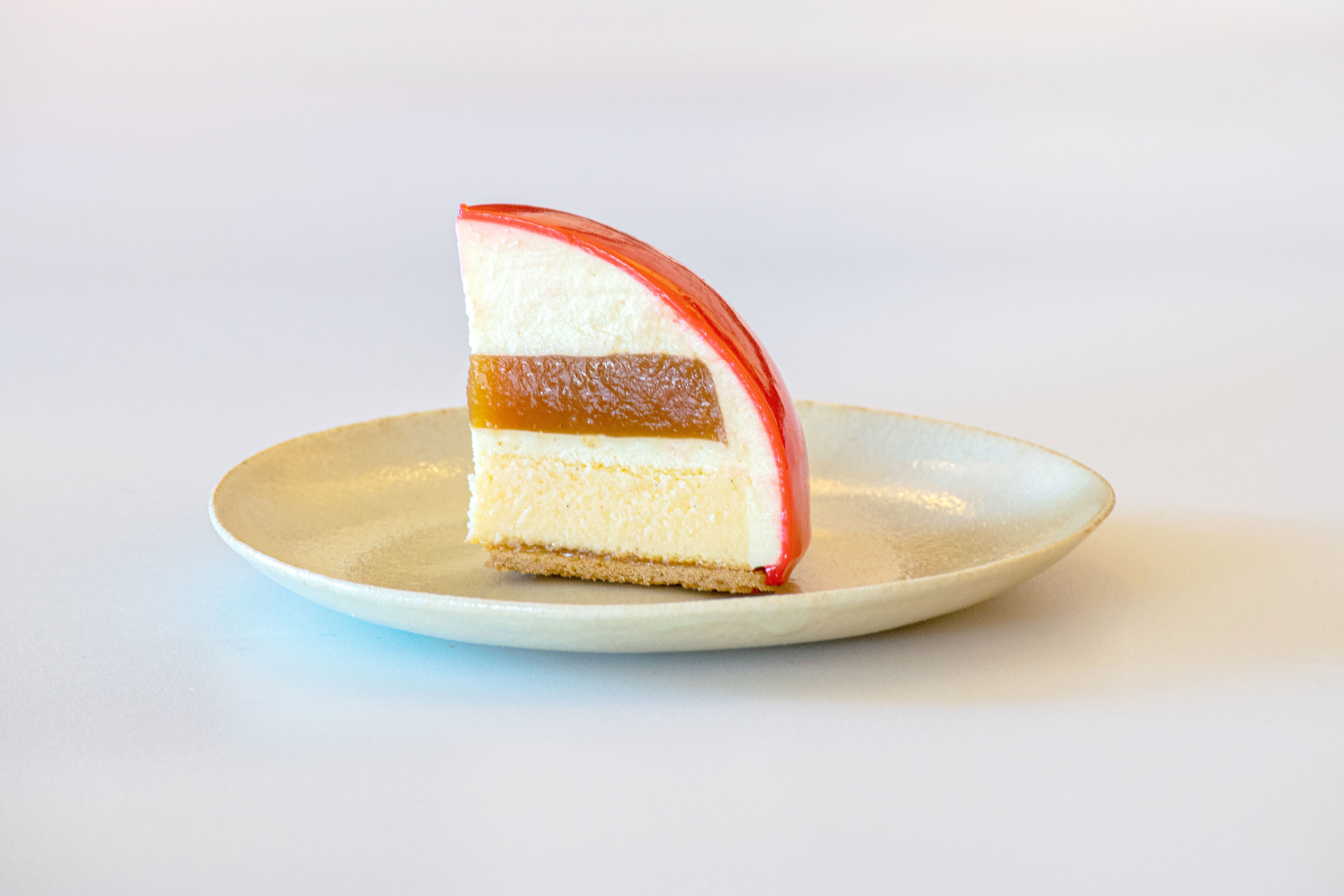 それぞれ単体で食べても美味しく味わえますが、アセローラジュレとチーズケーキ、はちみつムースを一緒に食べて一番美味しくなるようにつくりました。ぜひ三位一体の美味しさをお楽しみください。