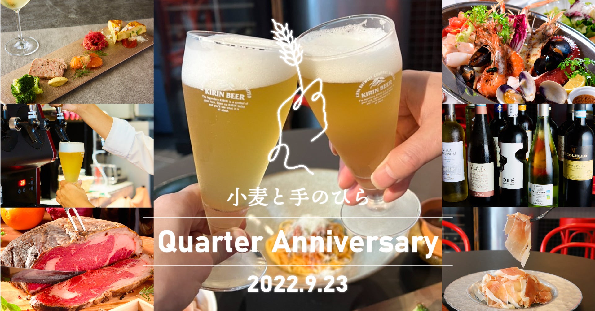 2022年9月23日(祝・金)にオープン3カ月を迎える「小麦と手のひら」。当日は折しも「おいしい小麦の日」だそうで、“小麦”を冠に掲げる当店には持ってこいの記念日となります。そこで、クオーターアニバーサリーを盛り上げるべく、食べ飲み放題イベントを開催いたします。