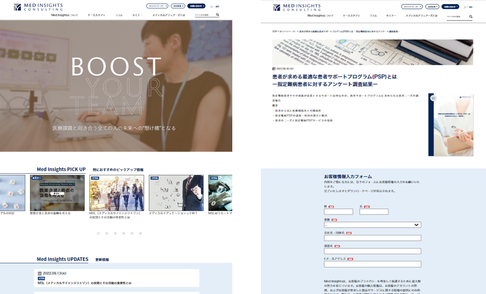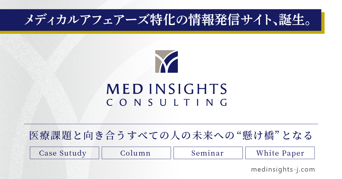 製薬業界において患者中心の医療(Patient Centricity)の実現に向けた取り組みが強化され、その中心を担うメディカルアフェアーズ分野の重要性がますます高まっています。一方で、国内においてこの分野に関する情報は限定的で分散されており、入手が容易ではない状況が続いています。当社は2016年のメディカルアフェアーズ事業部門の創設以来、多くの製薬企業および医療機器企業に対して様々なコンサルティングサービスを提供してまいりました。新ウェブサイト「Med Insights」はこの経験を活かしメディカルアフェアーズ分野の総合的な情報発信を行い、Patient Centricity実現に貢献すると同時にメディカルアフェアーズの社会的価値の認知向上を目指します。