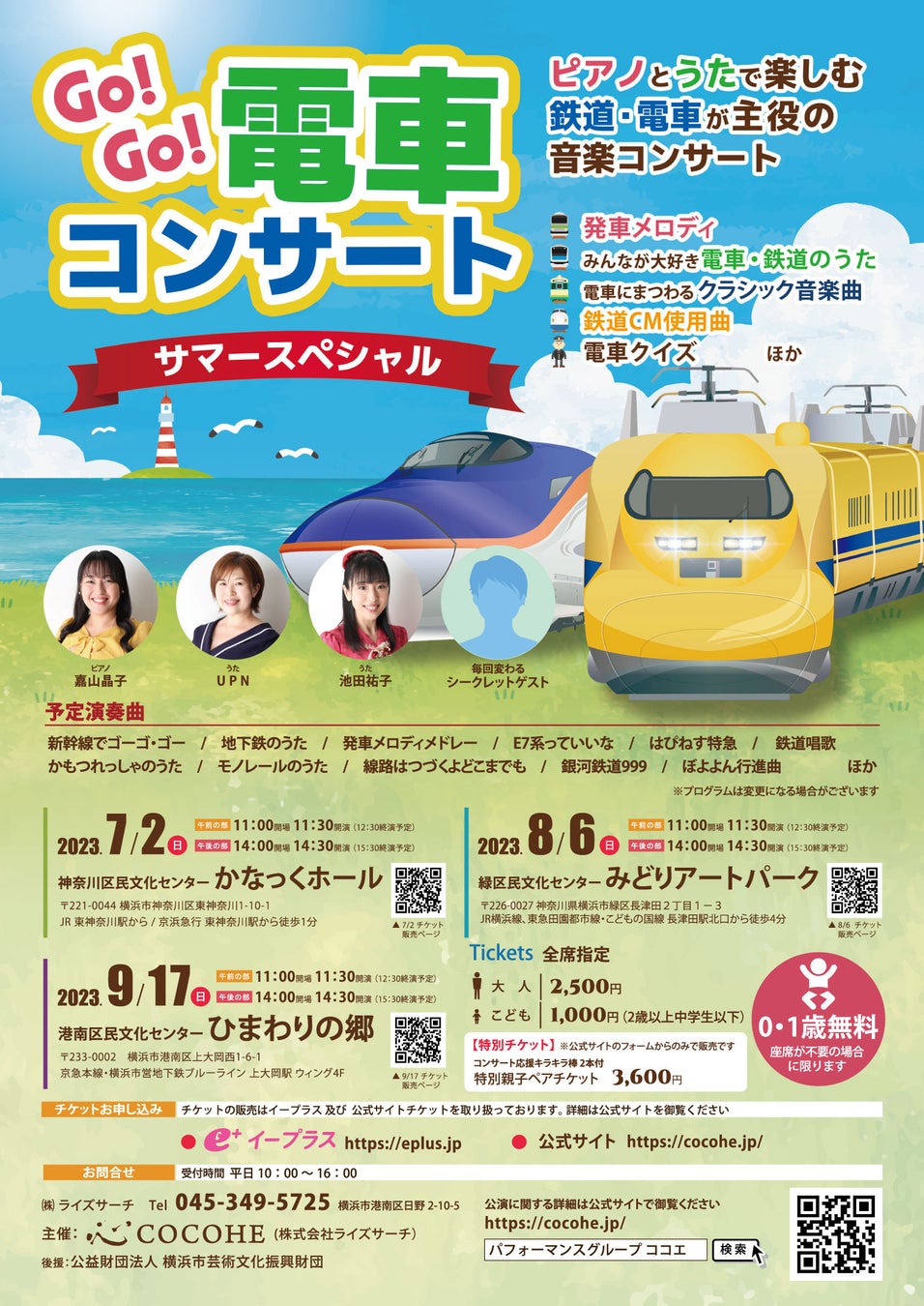 「Go!Go!電車コンサート」は8月6日(日)に横浜市緑区民文化センター みどりアートパーク、9月17日(日)に同じく横浜市港南区民文化センター ひまわりの郷で公演が予定されています。