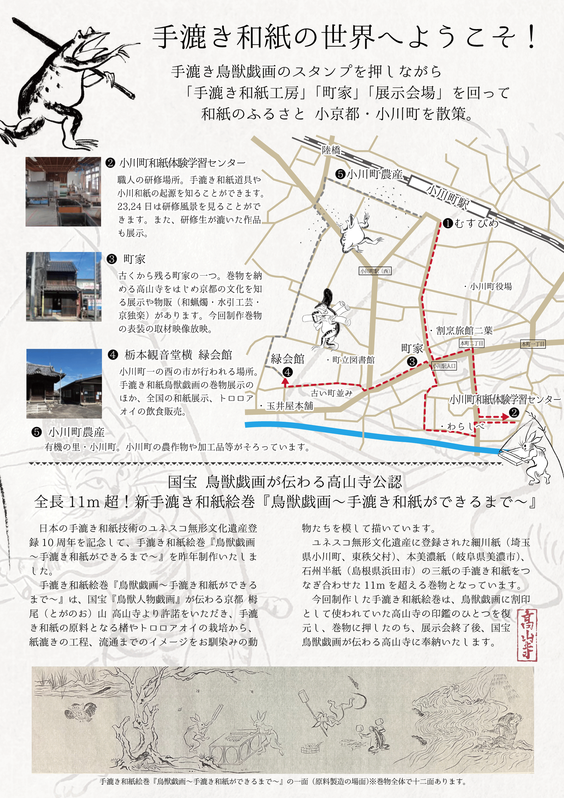 小川町駅前の観光案内所むすびめで手漉き和紙のはがきを受け取り、鳥獣戯画のキャラクターのスタンプを押して回りながら、和紙のふるさと・小川町を体感いただけます。