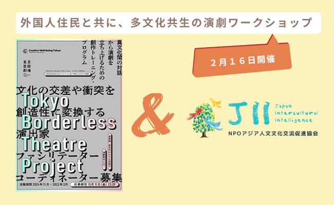 特定非営利活動法人アジア人文文化交流促進協会(JII)(本社:東京都目黒区下目黒5-27-5、理事長:石川憲彦)は、東京芸術劇場が主催する「異文化間の対話から演劇を立ち上げるための創作トレーニング・プログラム」Tokyo Borderless Theatre Project に協力し、外国人の視点に立ったワークショップの運営を提案します。