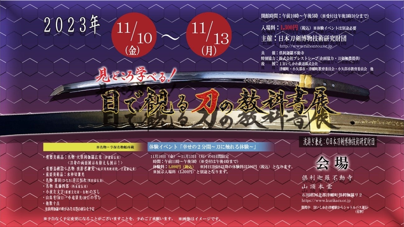 11月10日~13日開催「目で観る刀の教科書展」にあわせ、IRいしかわ鉄道では、臨時列車「大倶利伽羅号」を運転します。