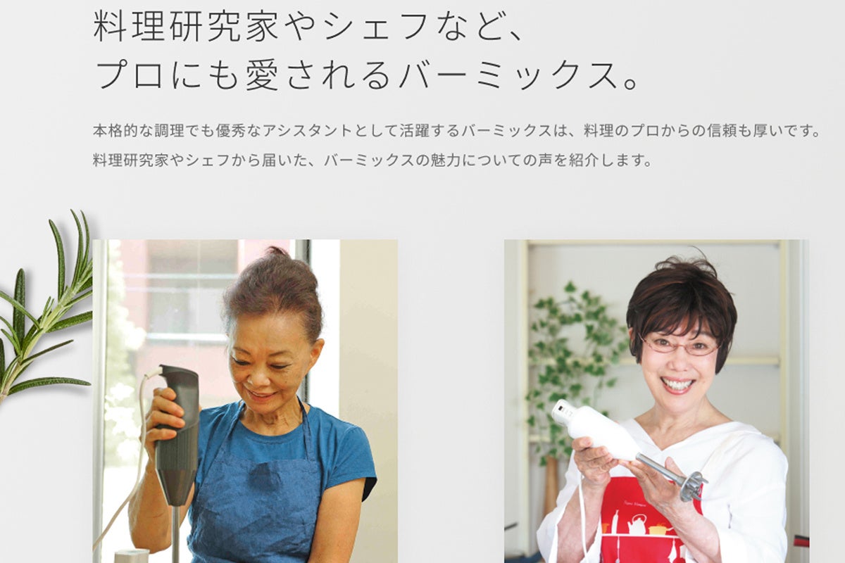長年のバーミックス愛用者である、料理家の有元葉子さん、平野レミさん、フランス料理店Ryuzuの飯塚シェフ、中国料理店Jeetenの吉田シェフの実際の愛用の内容をインタビューし、掲載しています。このページは今後拡充していく予定です。