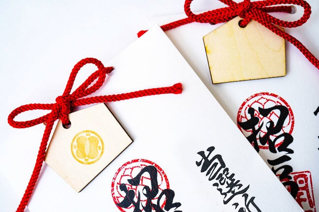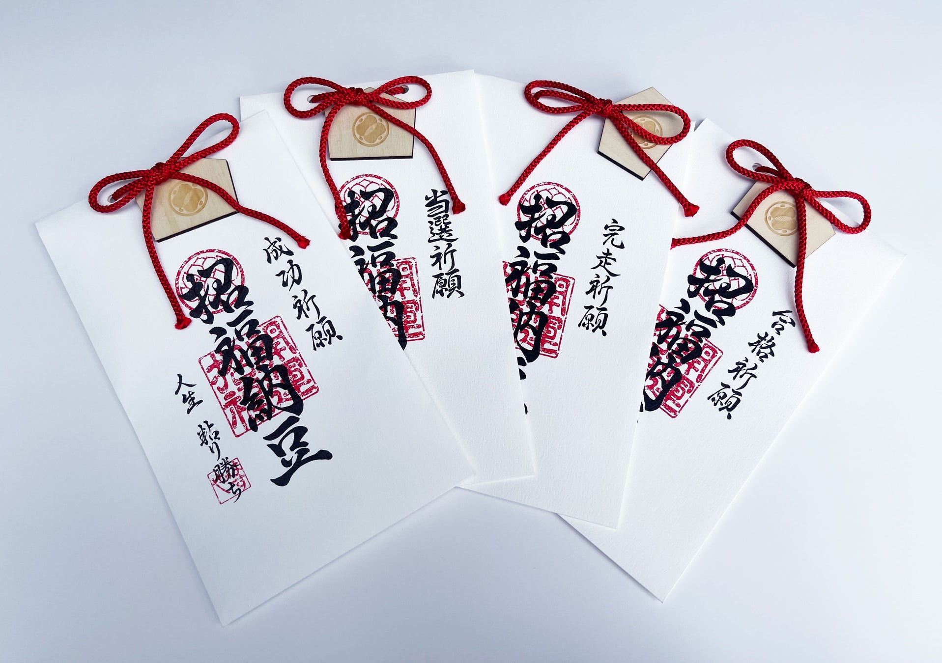 ユーモアあふれる御朱印風パッケージの筆文字には、書家による本格的な手書き文字が。従来からの「合格祈願」「完走祈願」に加えて、「当選祈願」と「成功祈願」のメッセージ入りタイプが仲間入りしました。