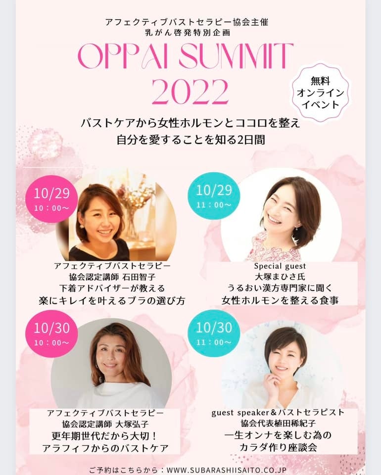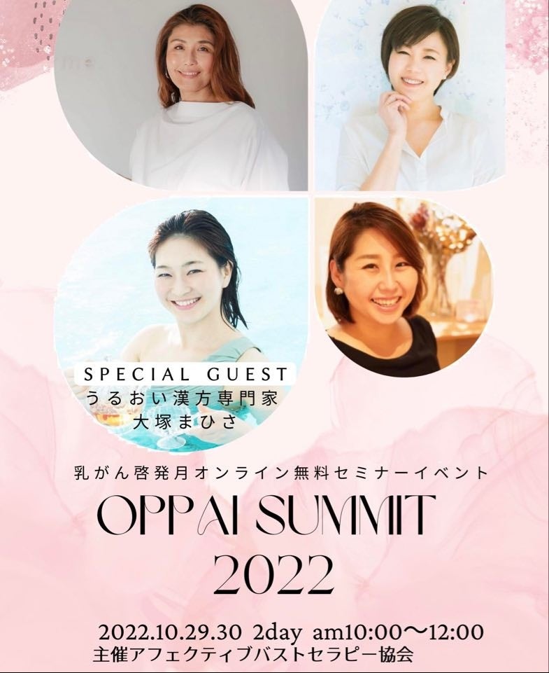 正しいバストの知識とセルフケアを全国の女性に伝えるアフェクティブバストセラピー協会(運営:株式会社美癒素 大阪府大阪市、代表:植田稀紀子)は、乳がん啓発月間に合わせてバストに悩む女性に10月29日、30日の2日間【無料】オンラインセミナーイベント「オッパイサミット2022」を開催します。美乳を目指すことから乳がん予防啓発を伝えるオッパイサミット第3回目のスペシャルゲストは「うるおい漢方」著者の大塚まひさ氏が登壇。9月22日から参加者申し込みがスタート!