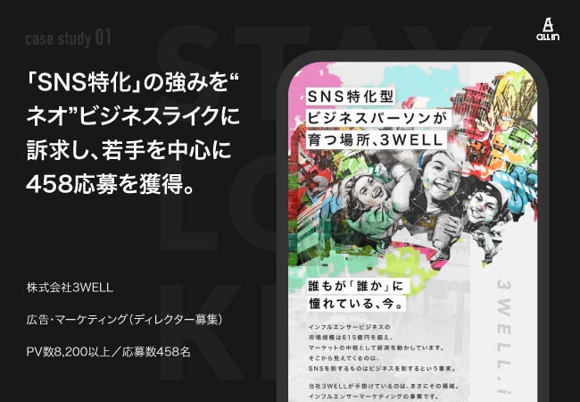 【課題】SNSを活用したインフルエンサーマーケティングのプロとしてクライアントから高い評価を受けている3WELL様。華やかな業界だからこそイメージ先行によるカジュアル応募が多く、企業成長をさらに加速させる「ビジネス思考を持った若手」の母集団形成にお悩みでした。