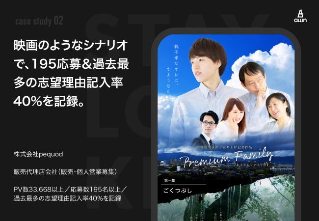 ご提案したのは、まるで映画のような【シナリオ広告】。pequod様の原稿では、社員様がみな「誠実である」という特長と、「地方出身者が多い」という事実から、1人のペルソナを設定。何となく地元でフリーターをしている23歳の主人公が、友人の紹介でpequod様に入社し、成長して親孝行をするストーリーを作成しました。企業カラーと求職者の共感性を意識した企画により、「私もまさにこのような状況で、変わりたいんです」と志望動機を記載する応募者が増加。コアターゲットを中心に195応募を集めることに成功しています。