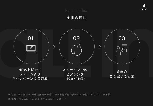年間160名の若手採用、応募数37名⇒2190名、内定承諾率15%⇒70%など、独自のクリエイティブで採用実績を残すオールインが、無料企画キャンペーンを実施します。