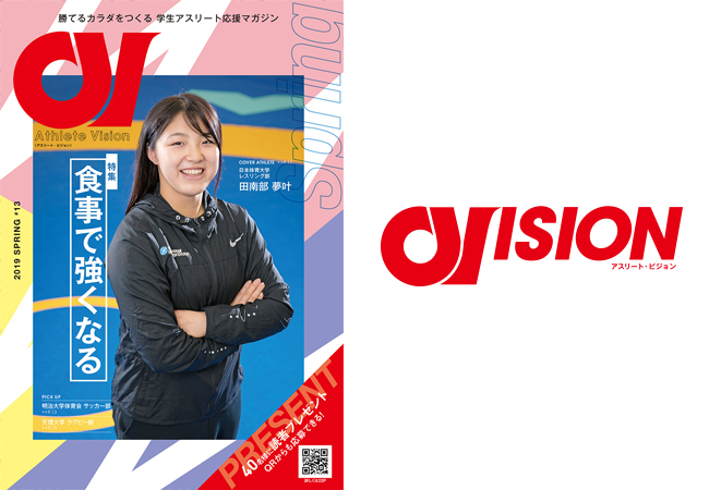 2016年4月に創刊した学生アスリート応援マガジン『Athlete Vision〔アスリート・ビジョン〕』は、「勝てるカラダをつくる」をテーマに、競技力向上を目指す学生アスリートに向けてコンディショニングの情報を発信する唯一のフリーマガジンです。