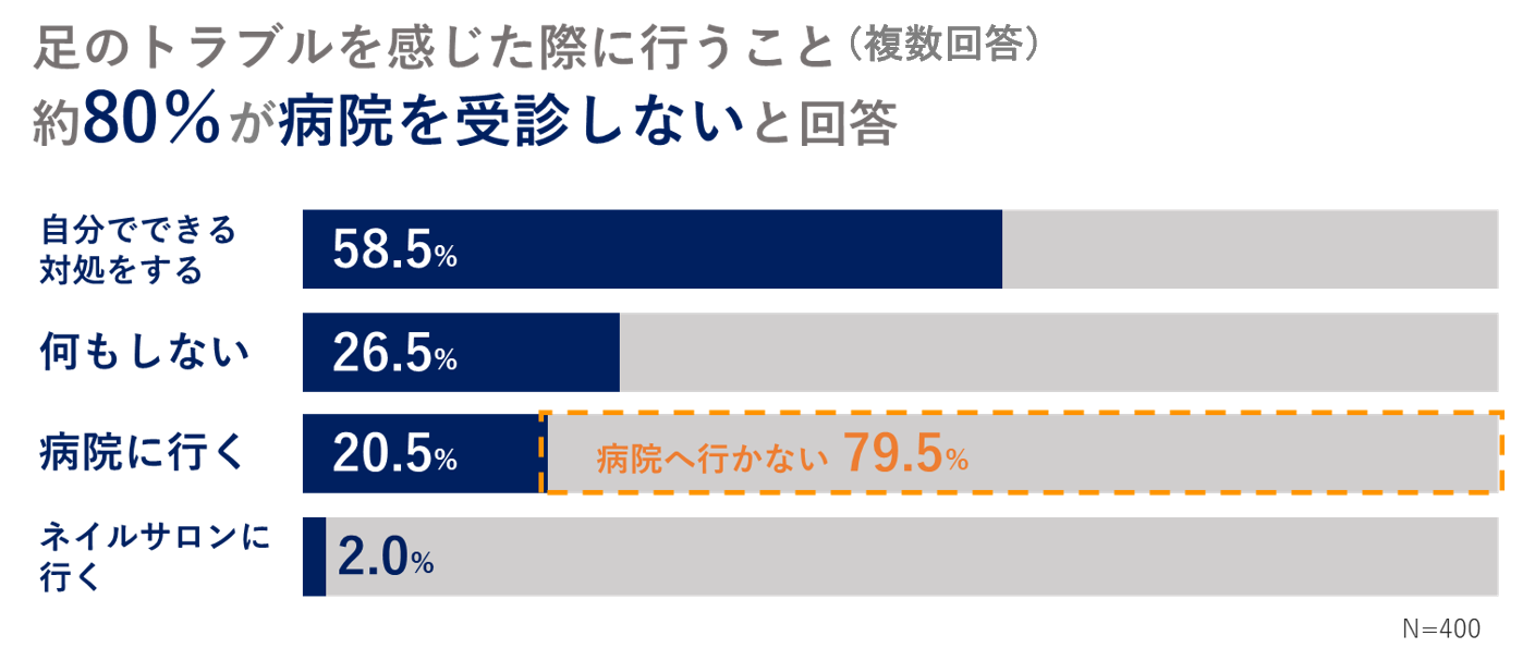 ②足のトラブルに「病院に行く」と答える人は20.5%。約80%が病院を受診せず