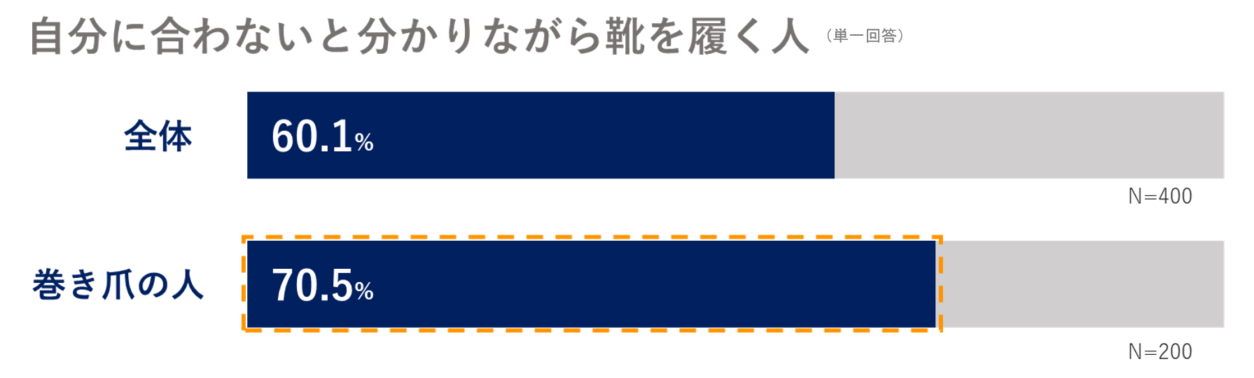 さらに自分に合わないとわかりながら履いている人は60.1%となり、半数以上が我慢して靴を履いているという結果が明らかになりました。さらに現在巻き爪を患っている人のうち70.5%が自分に合わないと分かりながら履いていると判明。