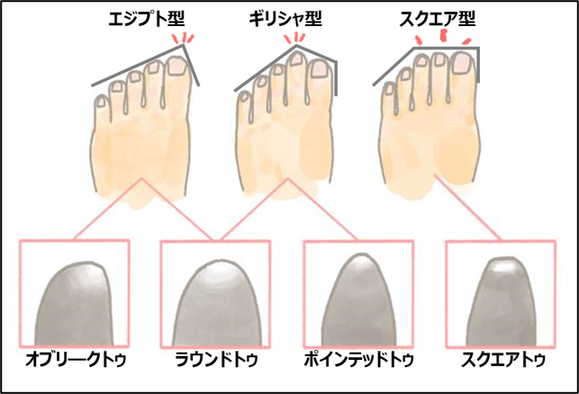 自分に合った靴選びのために、まずは、自分の足の形を知ることが重要です。足の形は主にエジプト型、ギリシャ型、スクエア型があると言われており、それぞれの足の形にあった靴があります。