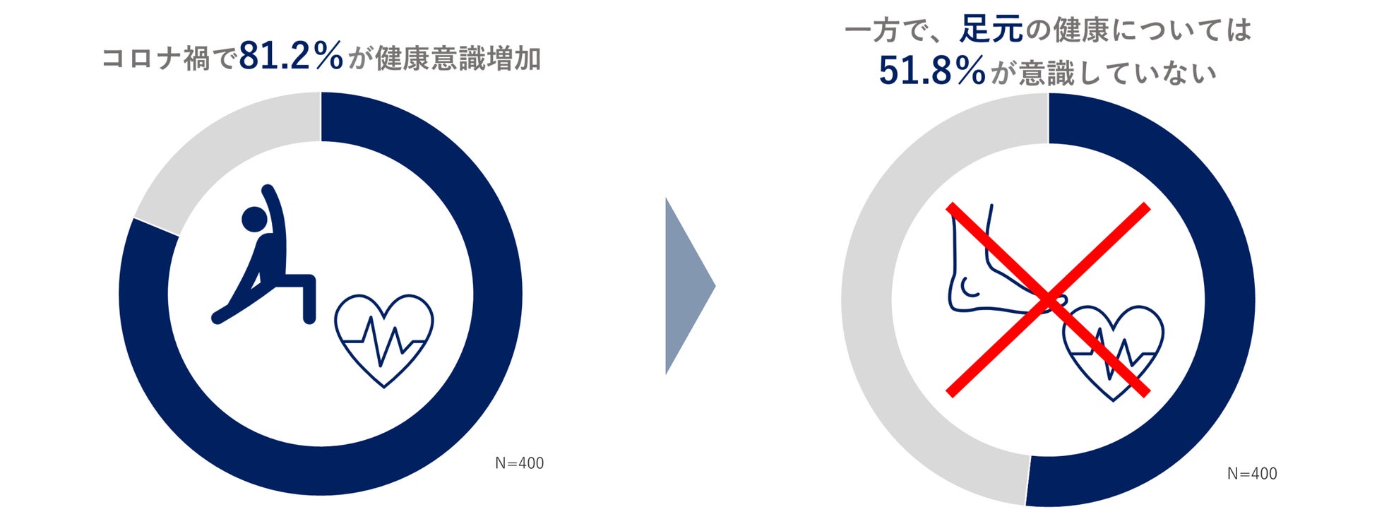 コロナ禍において、健康意識が増加した、という人は80%以上。しかし、「足元」に限ったときの健康については「意識していない」が51.8%と、足についての健康は意識が向いていないことが分かりました。