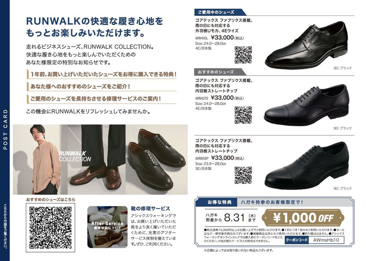 利用シーンを想起させるイメージとしながら、購入履歴などのデータを活用して割り出したおすすめの靴種やワイズを掲載しました。また、購入からの時間経過を説明し、修理サービスや足形計測コンテンツなどの情報も盛り込みました。