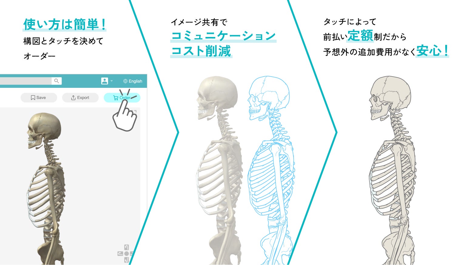 カスタムオーダー機能は、Premiumプラン、事業者・教育プランのユーザーに向けたサービスで、ユーザー自身が創った構図と、Exportした画像を元に、MEDITORシステム内で完結するメディカルイラストレーションオーダー機能です(画像加工・イラスト・3Dモデリング・アニメーションを作成)。決められた要件の中で、効率的で低価格・短納期を実現したサービスです。