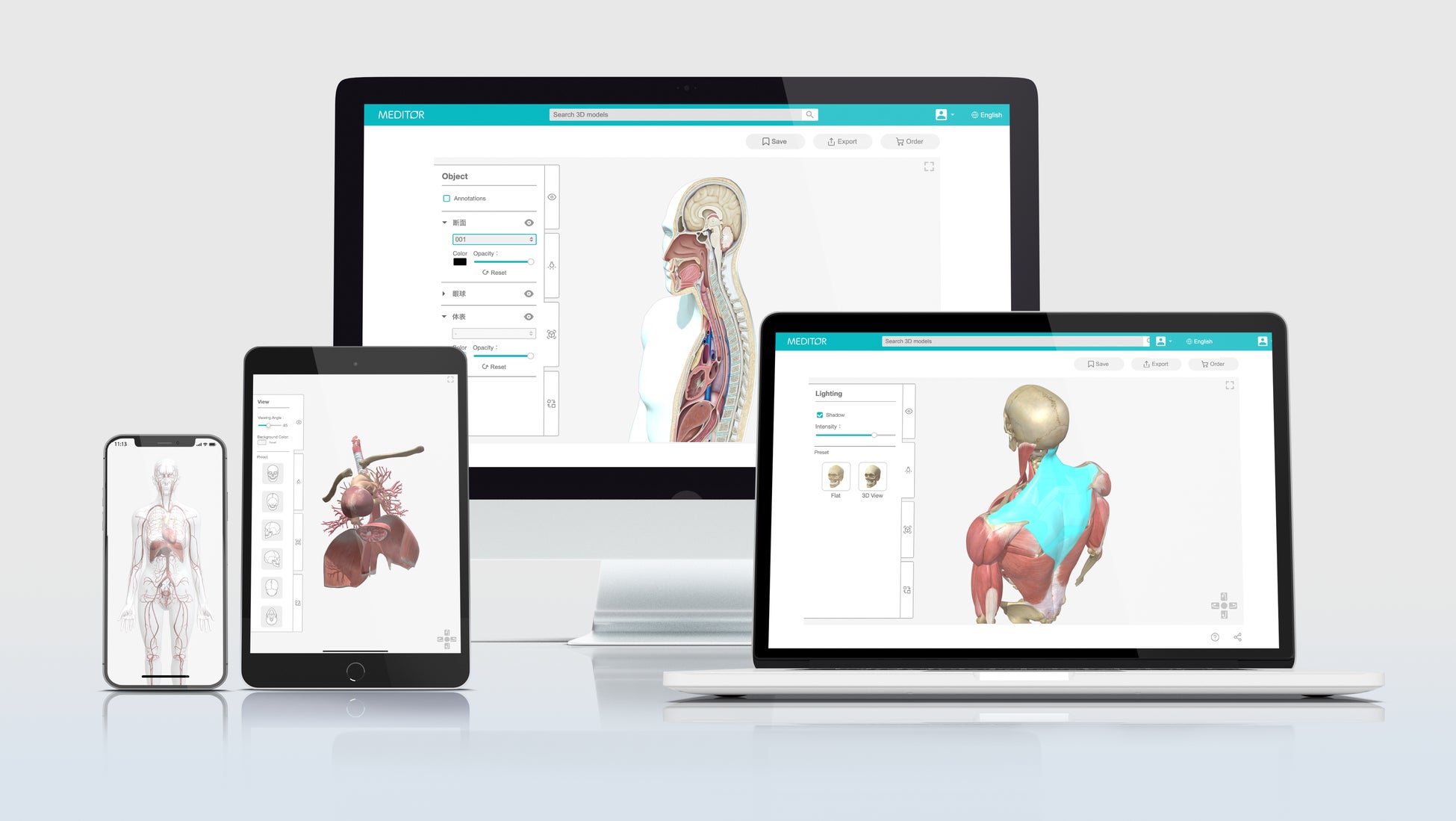 メディカルイラストレーション、メディカル3DCG制作会社の株式会社レーマンが昨年12月にローンチした「MEDITOR」(メディター)の初の国公立大学での利用が始まった。「MEDITOR」には医学に関する3DCGモデル100点が搭載され、角度やカラーなどを自由に操作し、欲しいメディカルイメージを自分自身で簡単に作成することができる。アプリからダウンロードした画像は著作権を気にせず改変、商用まで可能(プランによる)。3Dモデル数は今後も随時更新される。