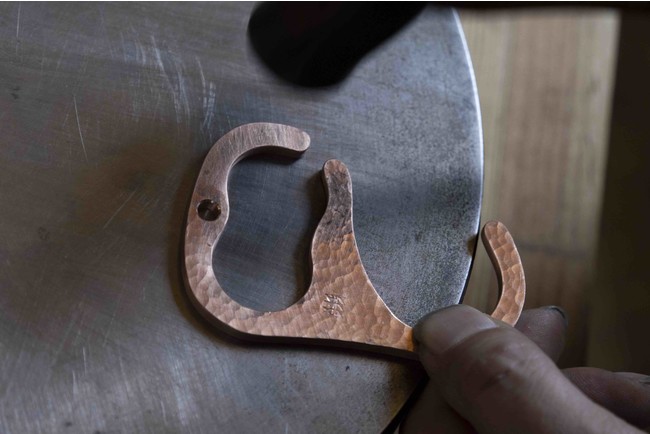 美しい槌目(表面)は使いこむほど艶を増していく、日本を代表する工芸品。世界中で行われている金属を叩いて成形するハンマーワーク技法の最高峰の技術として、近年は海外の美術愛好家を魅了している。伝統工芸の意匠とファッション性をMIX、新しい時代のプロダクツに仕上げたのが本商品“FINGER HOOK”となる。