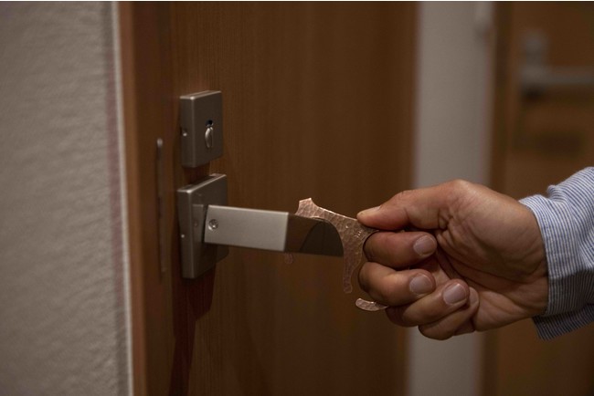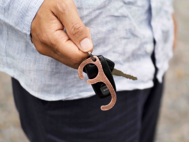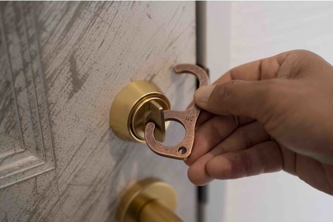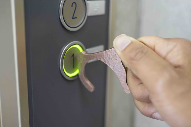 すぐれた抗菌・抗ウィルス性を発揮する“純銅製”で造られており、電車やバスの吊革、公共機関のドアノブ、エレベーターのボタン、タッチパネル、トイレの内鍵に手で直接ふれる事を防ぐ。厚さ4ミリの純銅製で出来ており、重い扉にも対応する頑丈な造りとなっている。