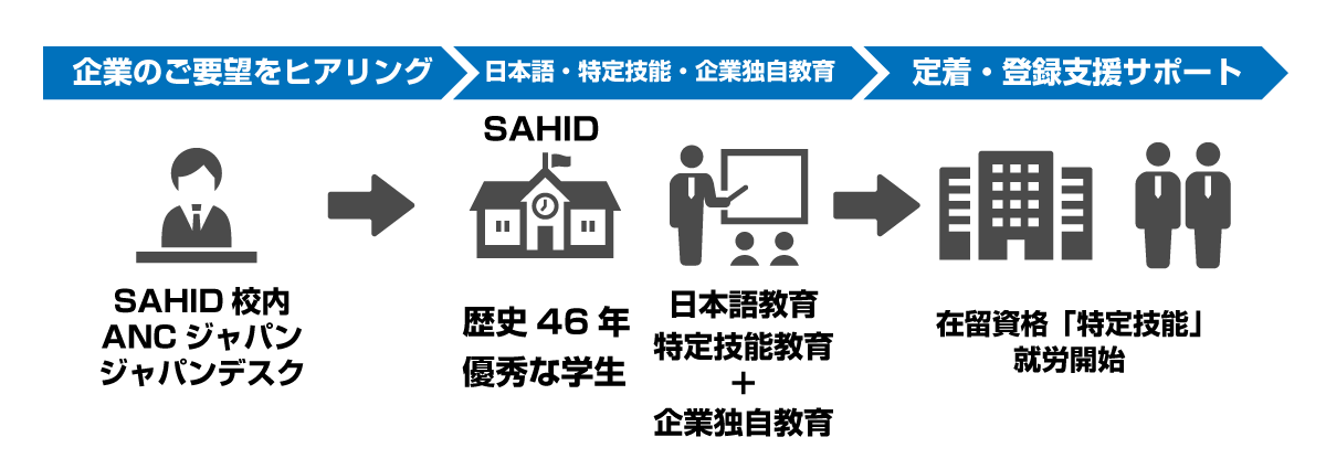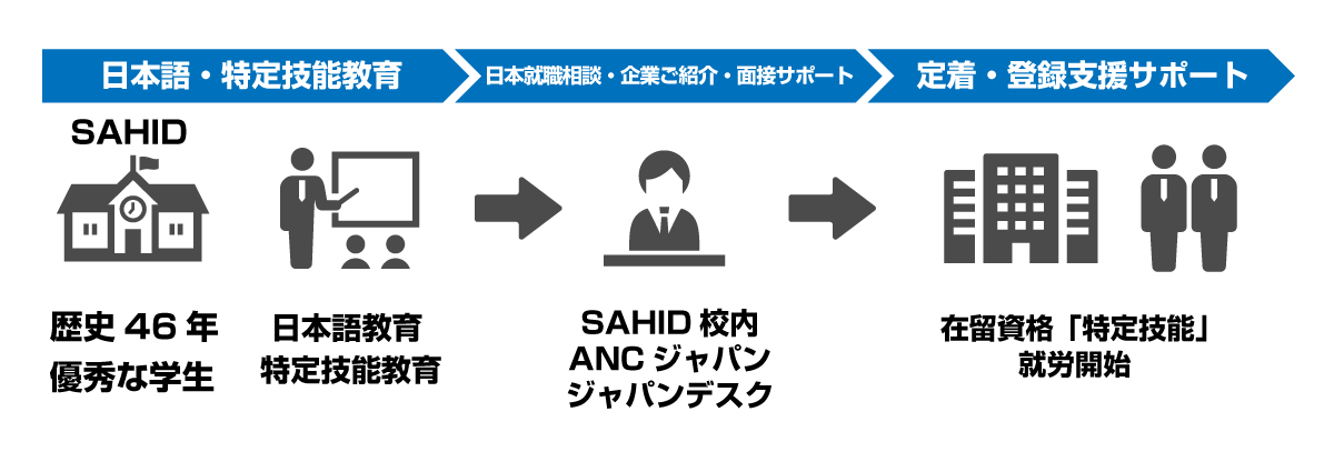 SAHIDは、大学・職業訓練校に在学している学生に対し、学生募集や教育関連の施設の提供、専門分野の教師の提供。ANCジャパンは、インドネシア側では、日本語教育・日本企業就労へ向けた文化教育・特定技能試験教育・就職先の斡旋、日本側では、登録⽀援機関としてインドネシア側が送り出した⼈材の入国から生活サポートまで、ワンストップサービスとして提供する。