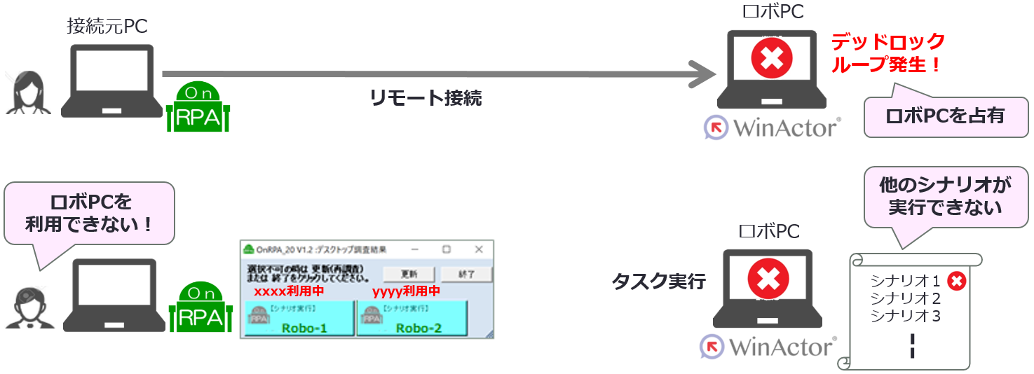 OnRPAは、リモートデスクトップ接続の競合、PC解像度や拡大縮小倍率の違いによるシナリオエラーを解決する