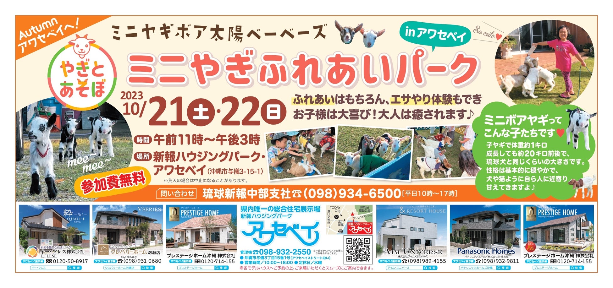 琉球新報社は10月21日と22日の2日間、総合住宅展示場「新報ハウジングパーク・アワセベイ」(沖縄市与儀3-15-1)で「ミニやぎふれあいパークinアワセベイ」を開催します。穏やかで人懐っこいミニボアヤギとの触れ合いやエサやり体験ができ、子どもたちに大人気で、大人も癒されること間違いなし!