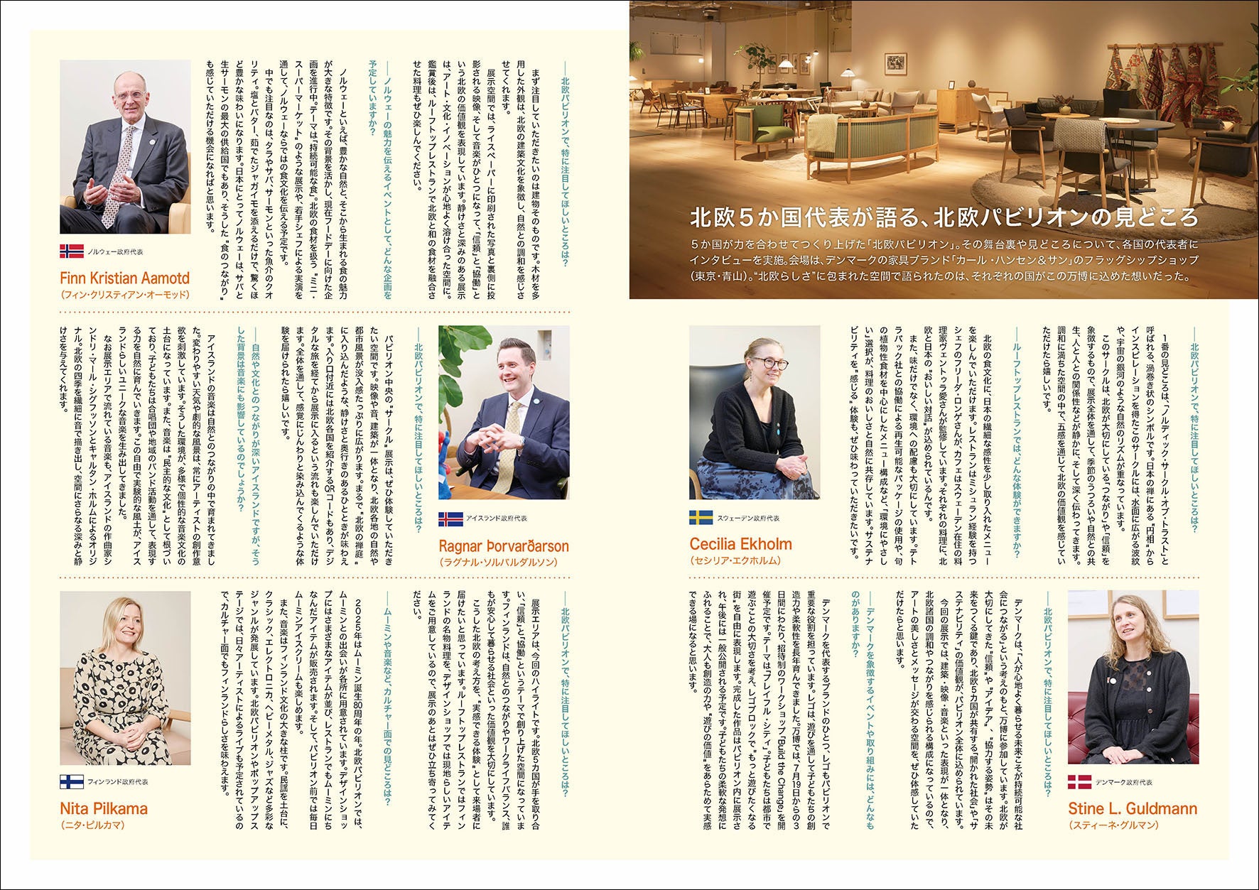 さらに本誌では、フィンランド、スウェーデン、デンマーク、ノルウェー、アイスランドの各国代表にもインタビューを実施。北欧パビリオンの見どころや、国ごとのテーマに込めた想いなど、それぞれの視点から語られる言葉には、訪れる前に知っておきたいヒントが詰まっています。