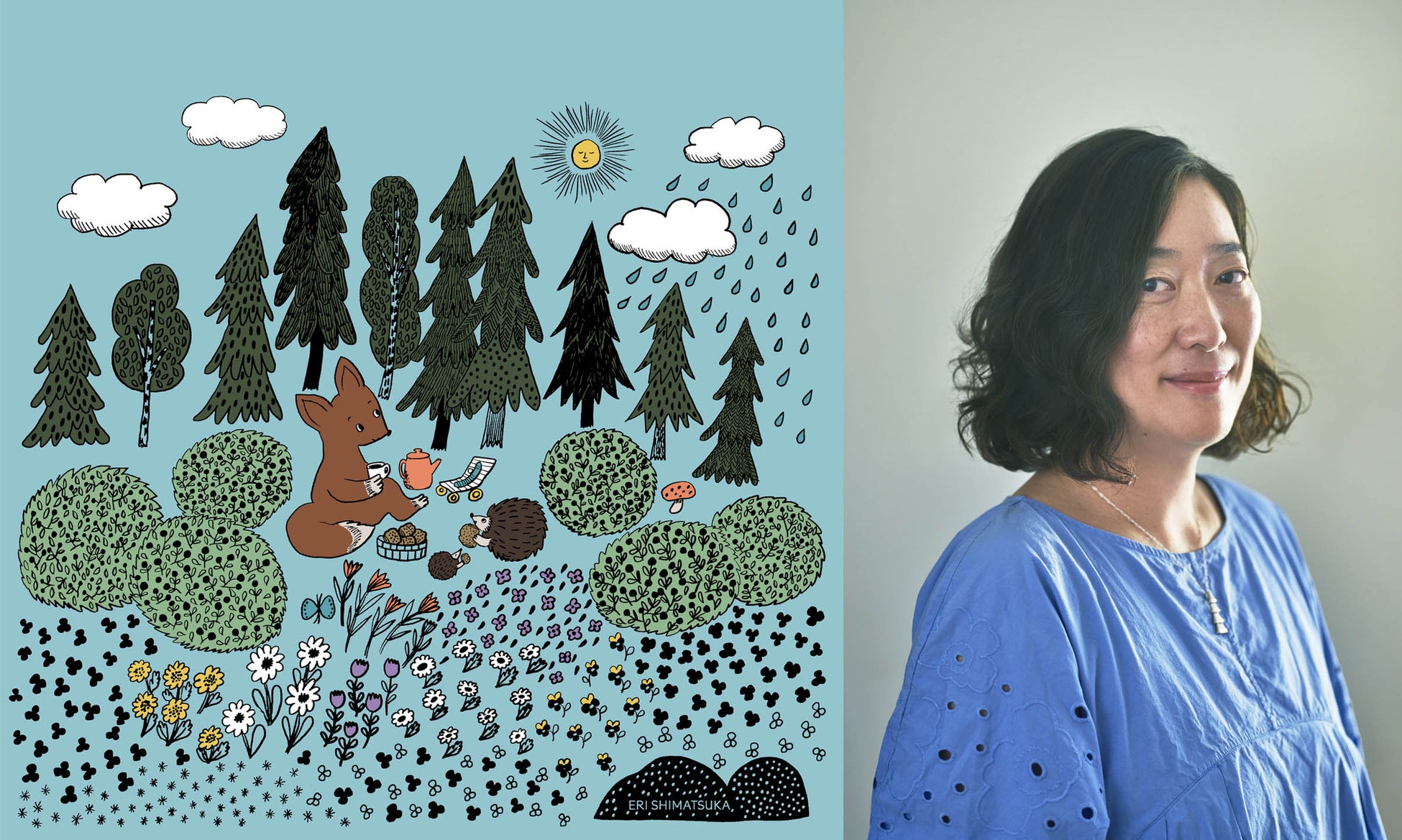 彼女が絵と訳を手がけた初の絵本『しずかなところはどこにある?』(岩波書店)に登場するキャラクターたちが、森の中で穏やかなピクニックを楽しむ一場面が描かれています。
