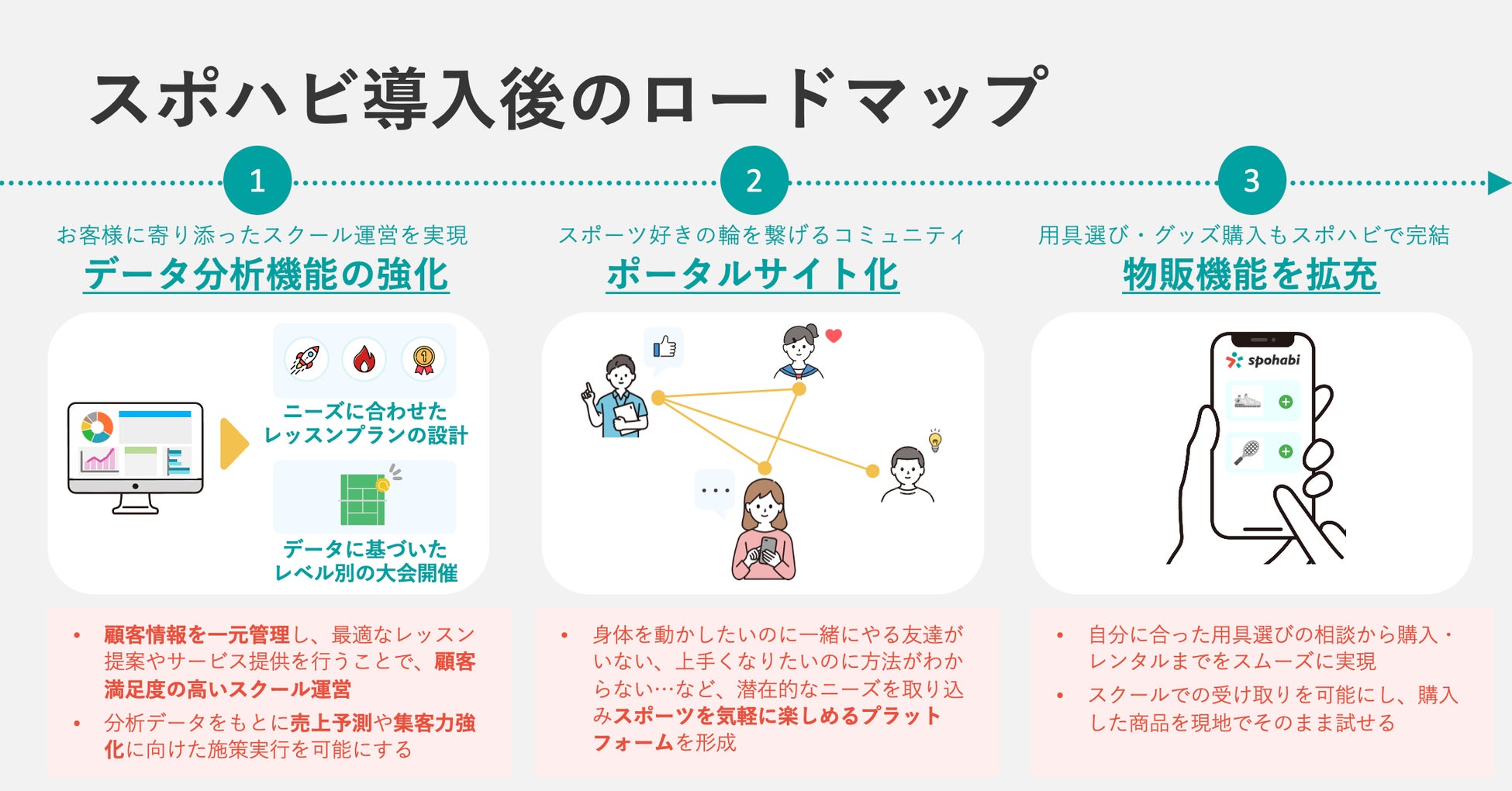 また、オンラインで相談しながら購入・レンタルでき、すぐにスクールで使えるEC機能も開発予定であり、サービスの拡充により、ITを用いてテニススクールの満足度の向上を実現します。