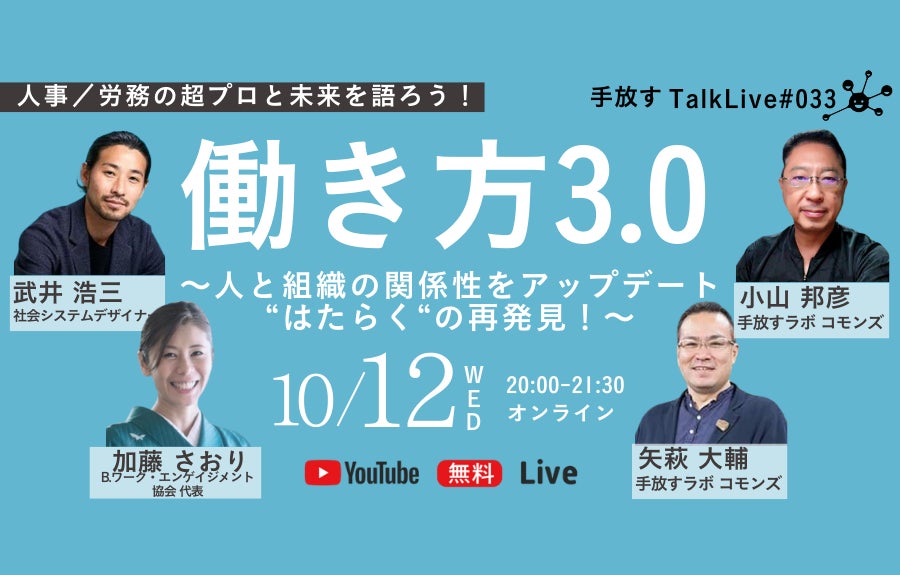 トークライブではコモンズに就任される小山邦彦氏、矢萩大輔氏をスピーカーに迎えて、自律分散型組織の第一人者である武井浩三氏、「B.ワーク・エンゲイジメント協会」代表の加藤さおり氏とともに、人と組織のあたらしい関係性づくりや、働き方の再発見を語っていきます。