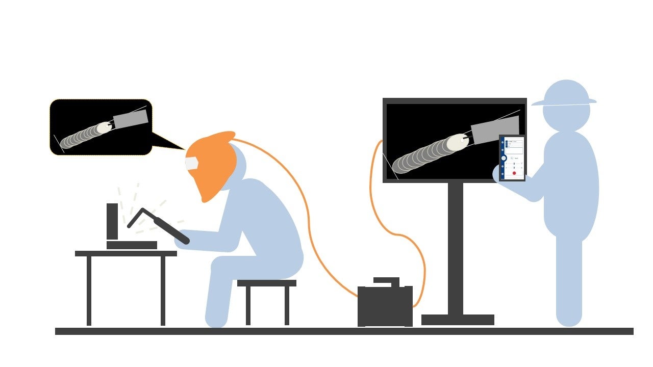 溶接者視野目線でデジタル化された画像や電圧・電流値などの各種情報は、共有・録画・記録が可能です。溶接映像をリアルタイムに多人数で共有したり、溶接の様子を模範となる溶接映像と比較して後で確認することができ、「見えづらい・見せづらい・伝わりづらい」という状況を解決します。