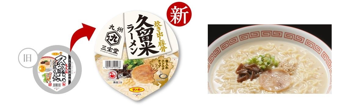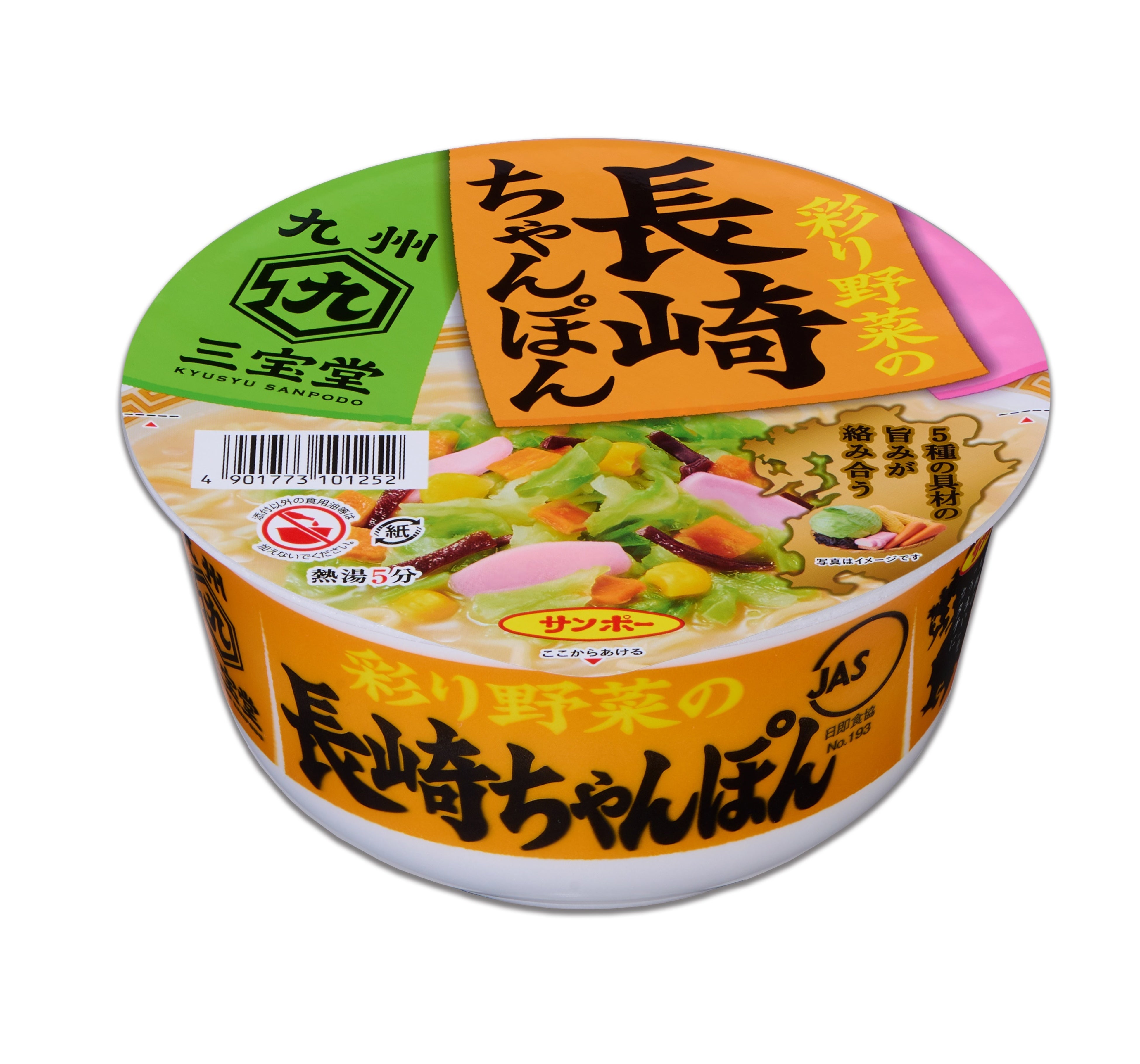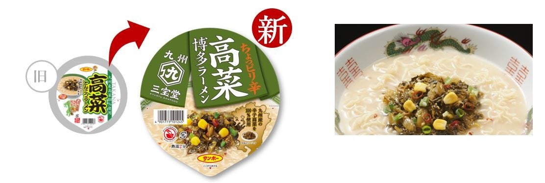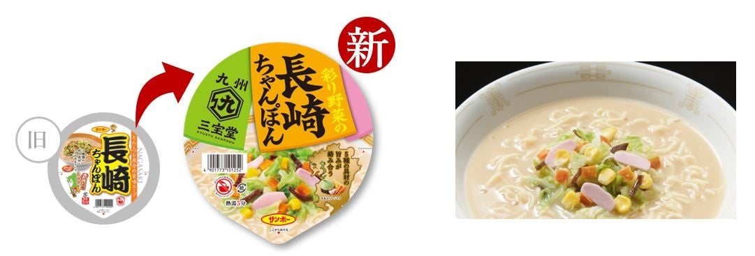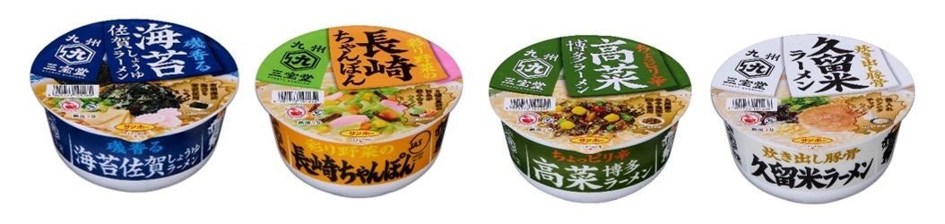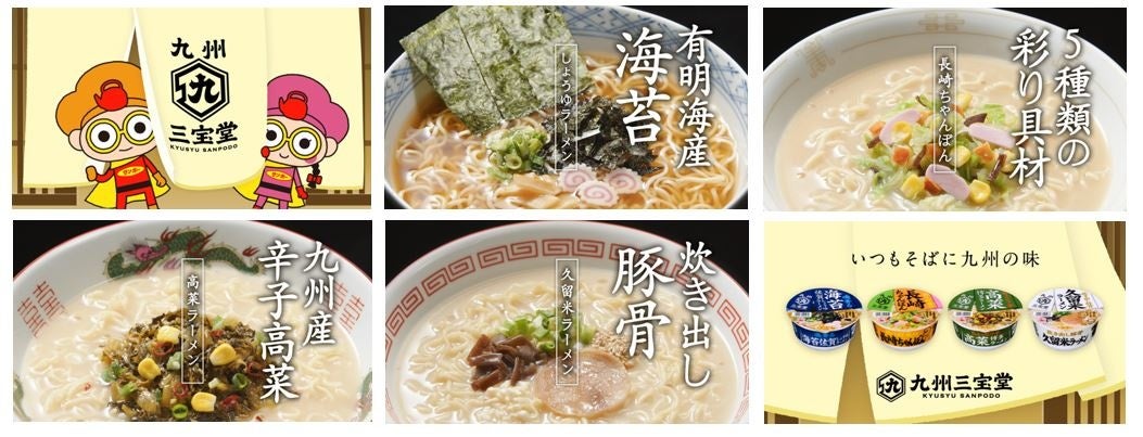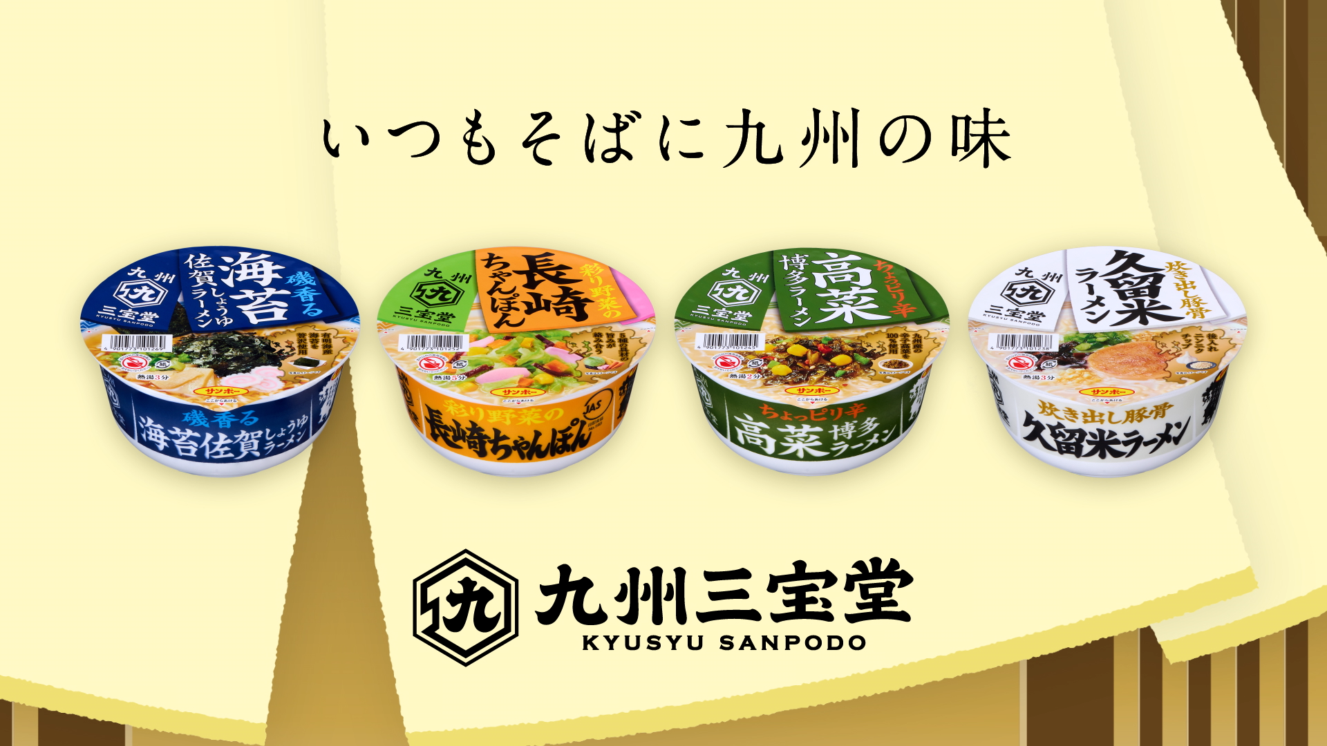今回ブランドリニューアルに至った『ご当地シリーズ』は1977年に発売した「長崎ちゃんぽん」を始め、「高菜ラーメン(1985年発売)」、「久留米ラーメン(1999年発売)」で構成されており、発売から長いものはおかげさまで約40年に渡りご愛顧いただくサンポー食品の定番商品です。『九州三宝堂』でもそのおいしさは受け継ぎます。