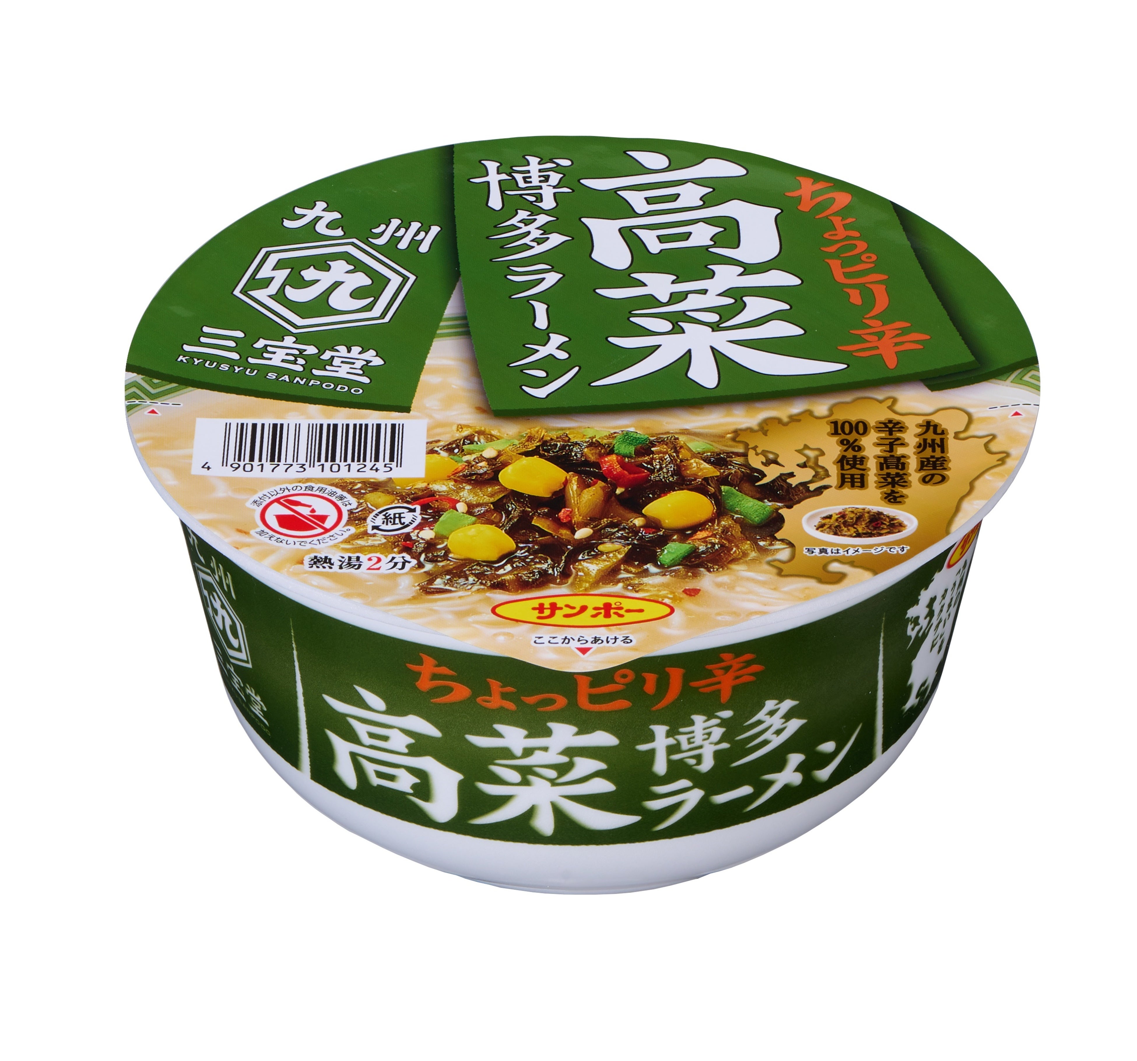 ■商品名:九州三宝堂 高菜博多ラーメン■商品特長:従来品に比べてゴマが増量!九州豚骨ラーメンの定番トッピングの辛子高菜漬けが後ひく美味しさ。九州産の辛子高菜を100%使用しています。