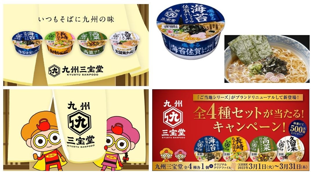 サンポー食品株式会社(所在地:佐賀県三養基郡 代表取締役社長:大石 忠徳)は、長崎ちゃんぽん、高菜ラーメン、久留米ラーメンを展開するカップ麺『ご当地シリーズ』を2022年2月21日(月)より、『九州三宝堂』としてブランドリニューアルします。また同日、『九州三宝堂』の新商品として「海苔佐賀しょうゆラーメン」を全国で発売します。