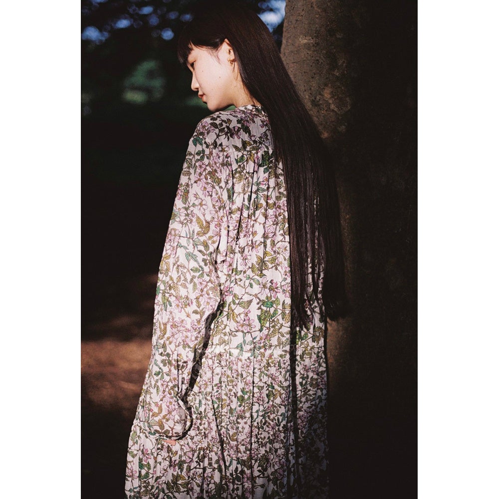 従来のフレンチスリーブからロングスリーブになり、着丈を10cm短くして、より足さばき良く軽やかに、フロントボタンの開閉でワンピースとしても羽織としてもお楽しみいただけるデザインになりました。