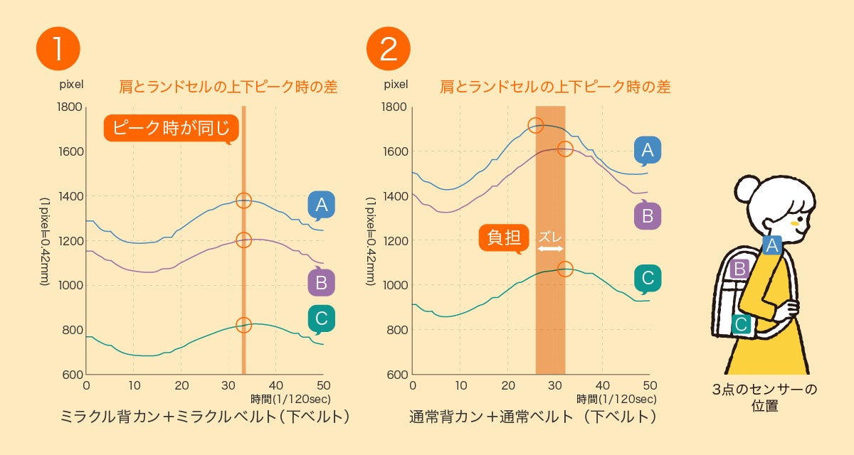 実験の結果、ミラクル背カン・ミラクルベルトを搭載したランドセルの場合はAの位置とランドセル上下のB・Cの位置の上下運動が連動しており、ランドセルと身体が密着していることがわかりました。(グラフ①)