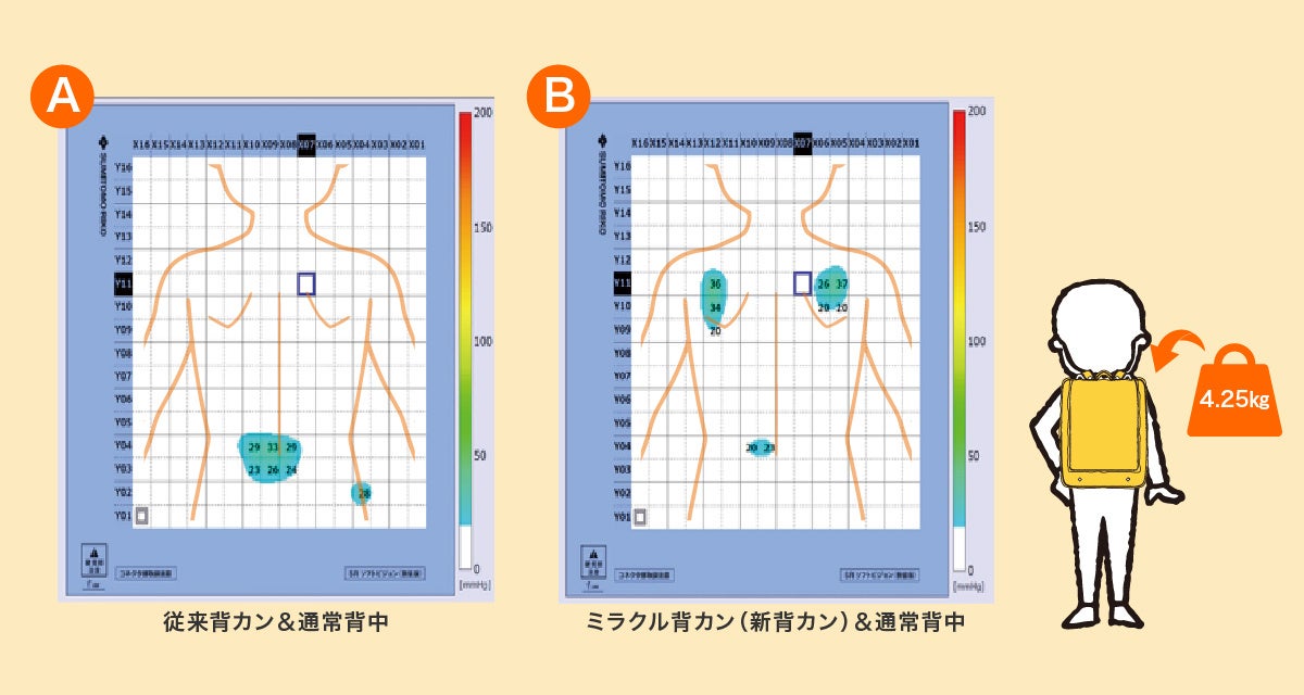 ミラクル背カンを搭載したランドセルと通常のランドセルそれぞれに約4.25kgの重りを入れて背中への体圧を測定しました。