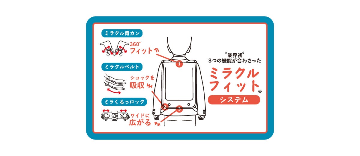 さらに、榮伸オリジナル機能である「ミラくるっロック」に新開発した「ミラクルベルト」と「ミラクル背カン」を合わせた3つの機能を「ミラクルフィットシステム」としてランドセルに搭載し、販売を開始しました。