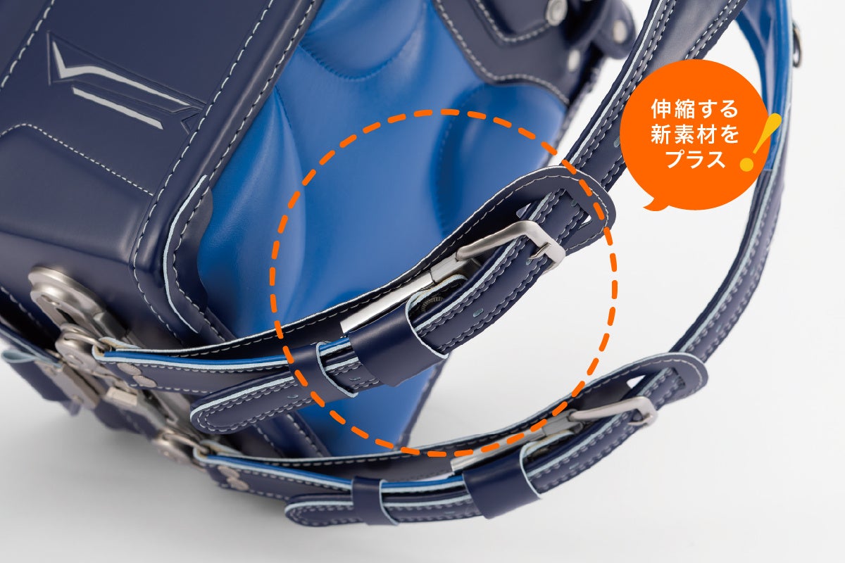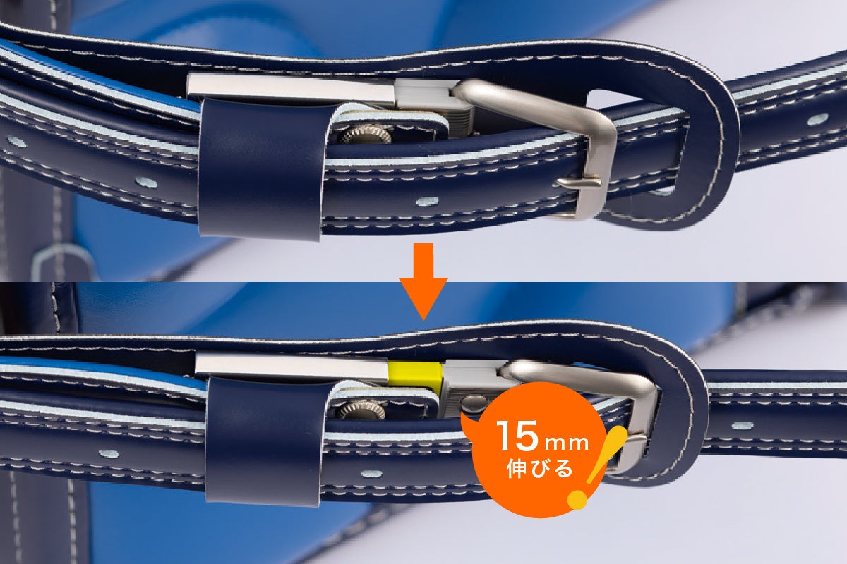 下ベルトに伸縮性のある新機能を内蔵することで、従来より身体にぴったり、隙間なくランドセルを背負えて、腰にランドセルが当たる衝撃も吸収することができる下ベルトです。【特許番号 特許第7129718号】