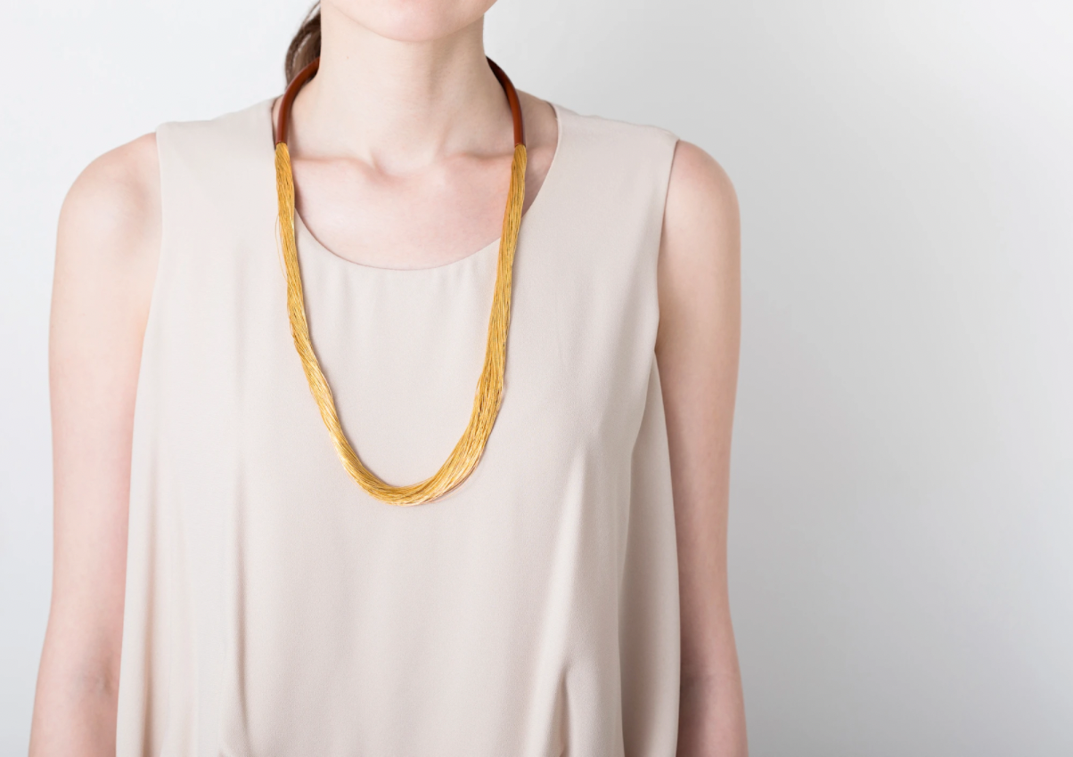昔から高貴な方の衣装装束に用いられ、「誇り」や「憧れ」を象徴するものとして重宝されてきた京都の金銀糸。その純金の糸でつくったアクセサリーのあたらしいかたち。純金箔を用いて制作する金糸の「たば」の表情をシンプルに表現して「絲tabane」(たばね)と名付けました。