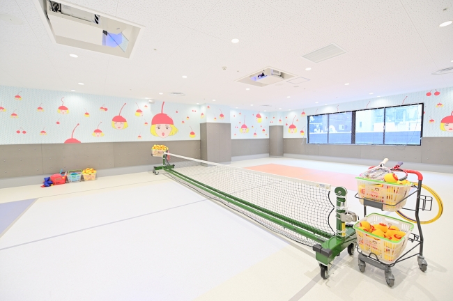 フロアいっぱいに広がるポップなデザインは、人気イラストレータ―竹井千佳さんが手がけました。ホワイトを基調とした室内に設けられたミニテニスコートと、それを取り囲むかわいらしいたくさんのイラストは、フォトスポットとしても楽しめます。