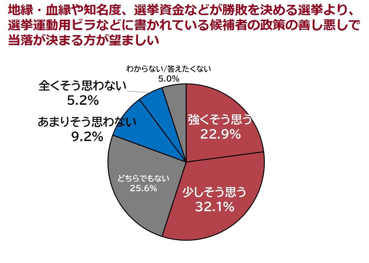 「地方議員は何をしているか分からない」52.7%/「選挙運動用ビラの政策で当落が決まる方が望ましい」55.0%/「マニフェストは検証されず言いっぱなしだと思う」71.4%