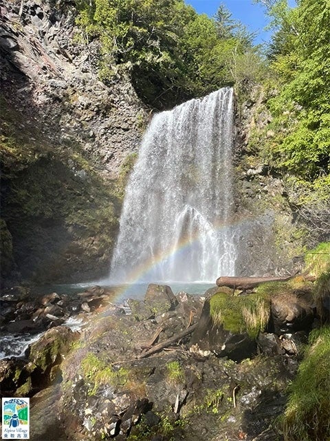滝つぼ近くでは、水しぶきとともに迫力のある姿を楽しむことができ、滝見台からは、乗鞍岳と滝の美しい姿を同時に望むことができます。また、晴れた日の朝には、太陽に照らされ虹がかかった滝を見ることができます。