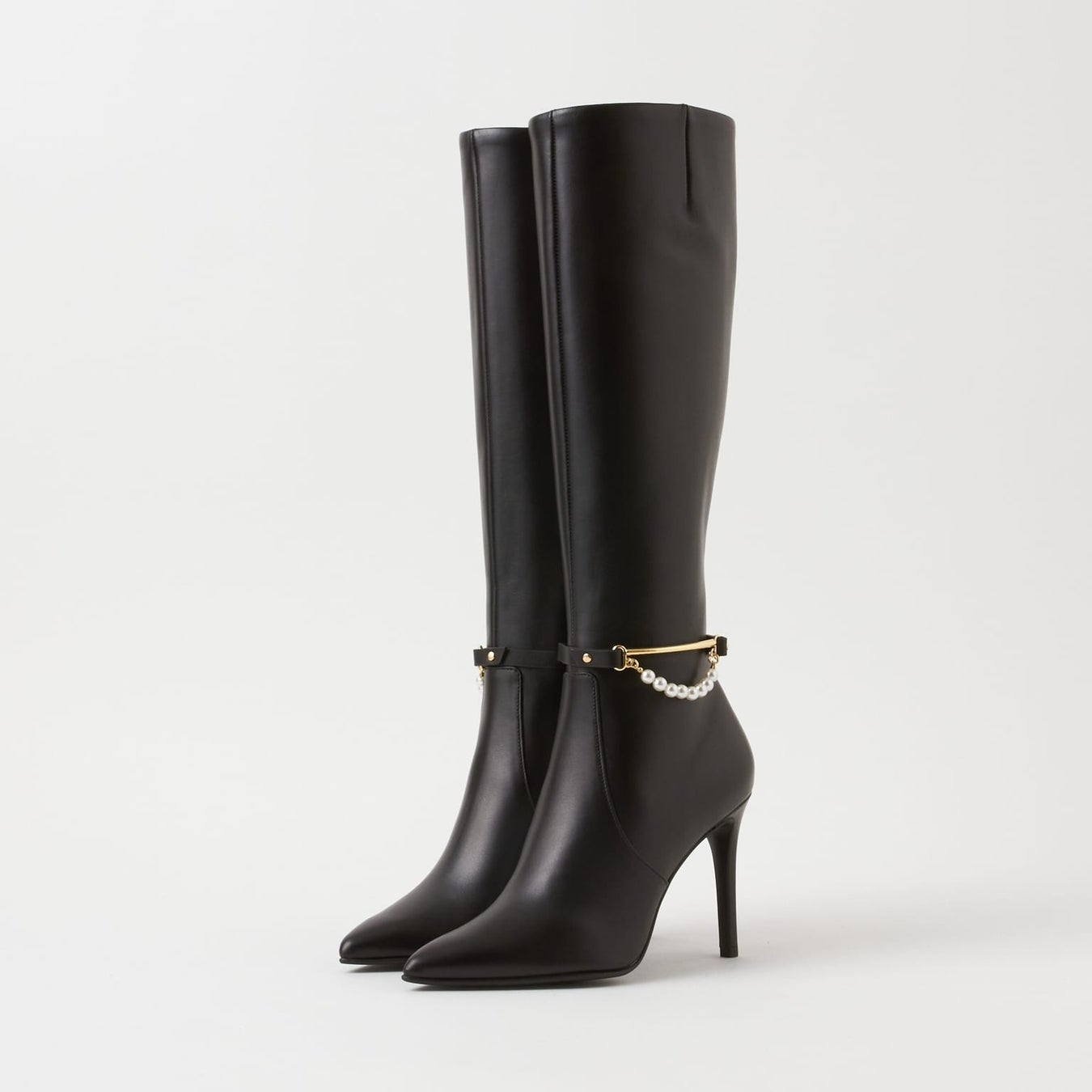 パールタイプ・ラインストーンタイプの2型をご用意。どちらも歩く度に”揺れる”作りになっており、お持ちのブーツに付けるだけで女性らしい華やかさを演出できます。ベルトの距離は3段階で調節できるようになっており、フィットタイプからセミルーズシルエットにまで対応が可能です。