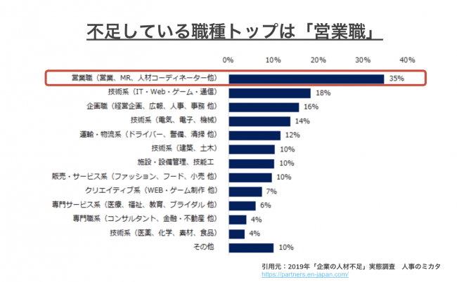 営業職は職種人口が約860万人と、日本の全職業人口の約13%を締めているものの、国内企業では売り手市場による需要が高まり、優秀な営業を採用するには、多くの広告予算が必要となっています。ゆえに、資金のある大手企業、知名度の高い企業に優秀な営業パーソンが集中し、それ以外の企業は常に営業不足の課題を持っています。