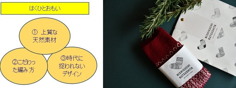 NISHIGUCHI KUTSUSHITAのそれぞれの商品は、独特のコンセプトを持っています。例えば“お風呂上りに履いてオウチ時間が始まる”シルクコットンホームソックスや“カシミヤを少しブレンドしたウォーキングにぴったりな靴下”などです。それぞれの個性を受け継がれた技術力で実現しています。