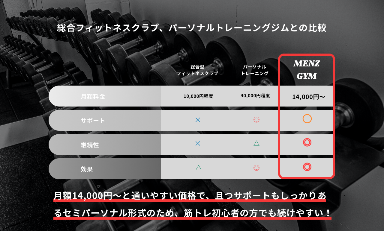 コストパフォーマンスにおいて、MENZ GYMは圧倒的です。フィットネスクラブでは指導が十分ではなく、継続しにくい環境。一方、パーソナルトレーニングは値段が張ります。筋トレの正しいやり方を指導してもらって継続したい。でも高すぎない方がいい。そんなあなたにピッタリなのがMENZ GYMです。