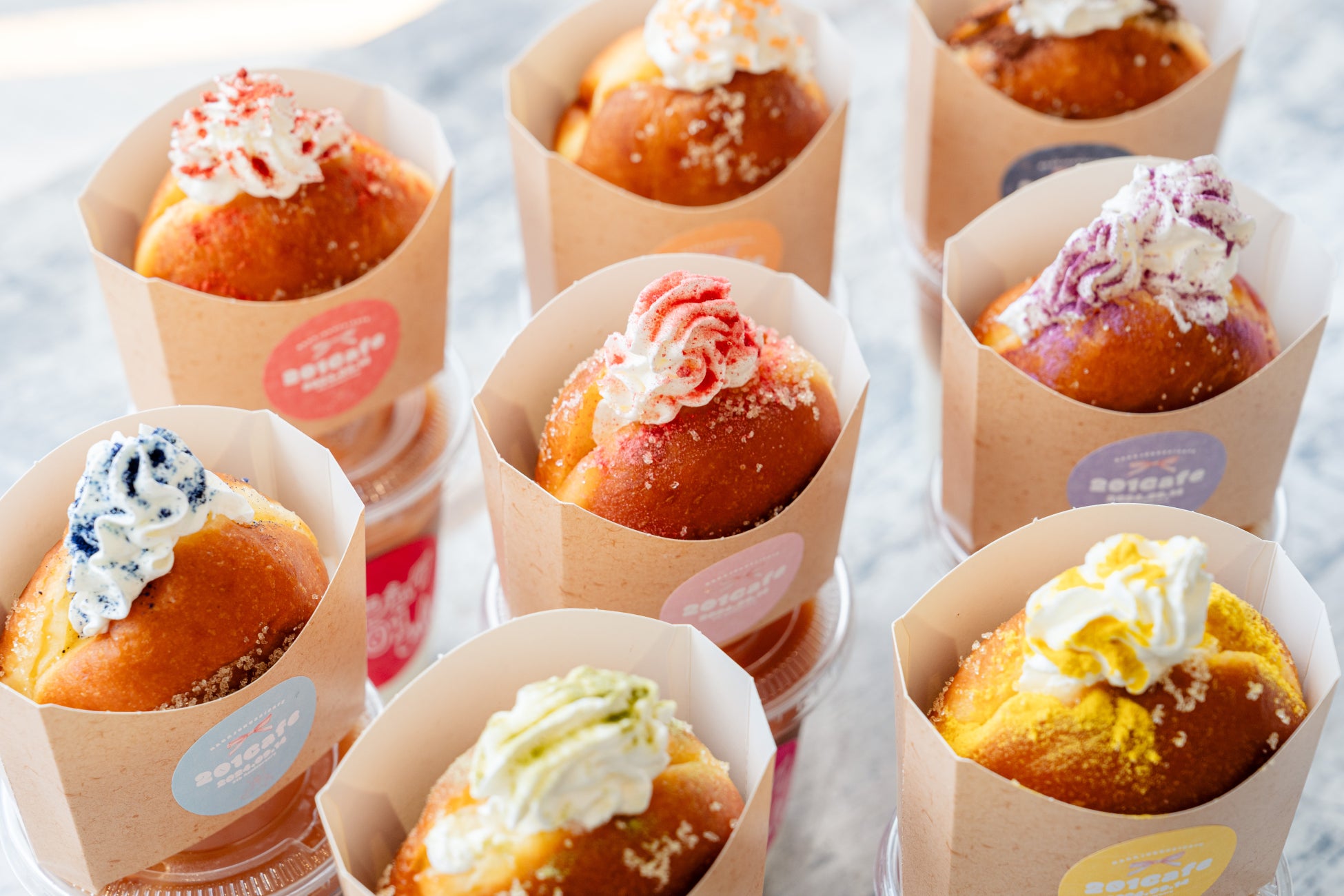「メンカラドーナツ」はふわふわのドーナツ生地にやわらかな優しい甘みとコクのある洗双糖と中には生クリームをたっぷり注入し、カラフルなドライパウダーをトッピングしております。